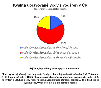 17.02.2009 07:24Ve zdrojích pitné vody bylo detekováno až 45 tis. různých příměsí! Norma v ČR určuje mezní limity 62 příměsí, standardní rozbory posuzují cca 6 položek. Na základě takovéto metodiky je "určováno", která voda vyhovuje pro pití a vaření! Pokud se v rozboru posuzuje všech 62 položek normy, výsledky nejsou nijak optimistické. O tom vypovídá graf: